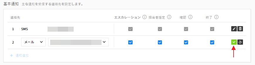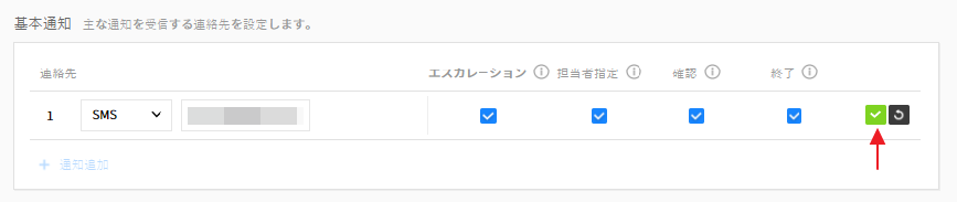 連絡先を「SMS」に選択した後、通知の受信状態欄にチェックしてからチェックボタンをクリックします。