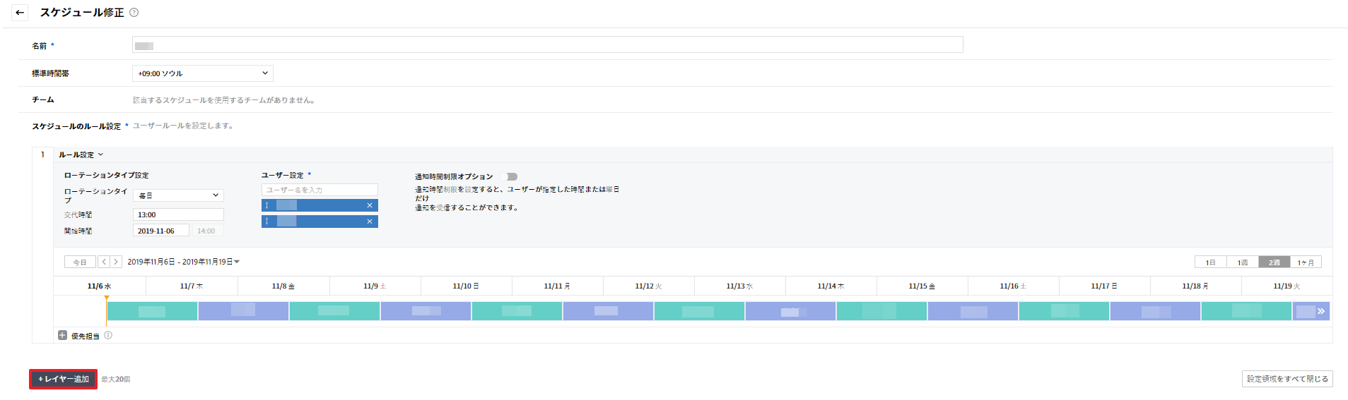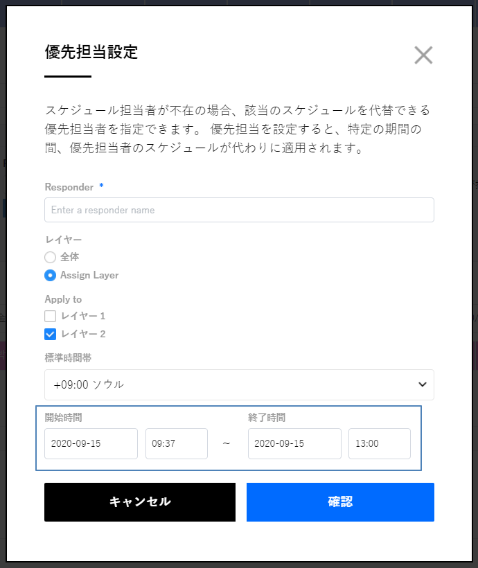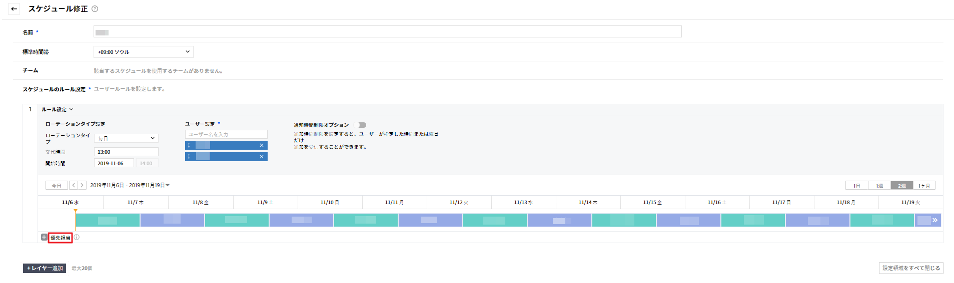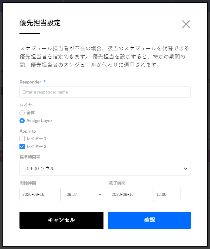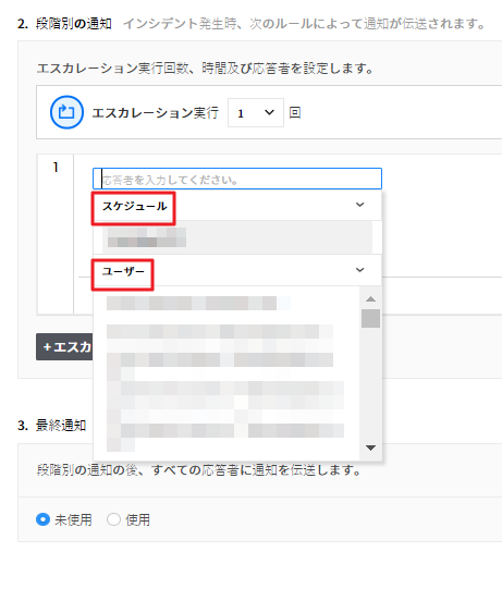 応答者の入力フィールドにエスカレーションを処理する応答者を入力します。応答者を設定するとき、スケジュールとユーザーに区分でき、複数個のスケジュールとユーザー選択が可能です。また、スケジュールとユーザーを同時に選択することもできます。