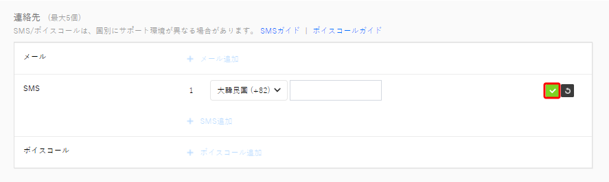 通知を受信する連絡先(携帯電話、有線電話)を入力した後、チェックボタンをクリックします。