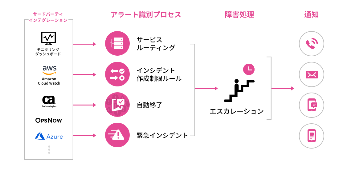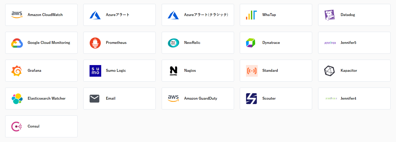 - インテグレーション:サード パーティ (外部)モニタリングツールで発生する通知は、AlertNowに接続するエンドポイントです。