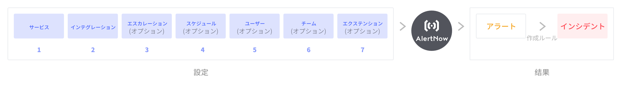 - 管理者の場合 サービス作成 → インテグレーション作成 → スケジュール作成(選択事項) → エスカレーションポリシー作成 → チーム作成(選択事項) → エクステンション設定(選択事項)の順で進行します。