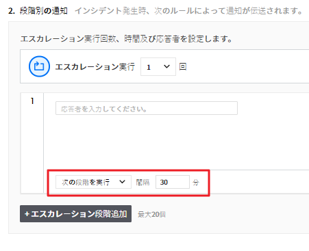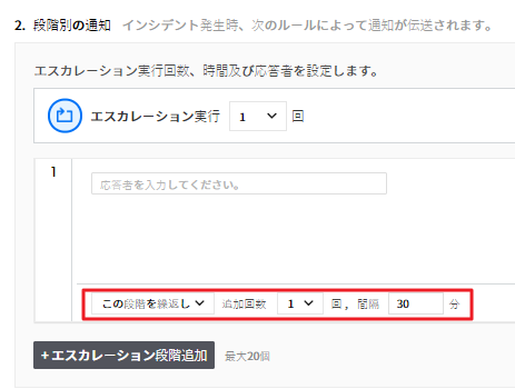 エスカレーションを次の段階に移す前に、該当段階を繰返し実行するように設定できます。下の画像のようにこの段階を繰返しを選択すると、現在の段階を繰返す回数と間隔を設定できる項目が表示されます。