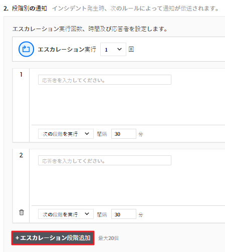 エスカレーション段階追加ボタンをクリックして、障害処理のための段階を追加できます。エスカレーション段階は最大20個まで追加でき、それぞれのエスカレーション段階を繰返し実行できます。[以前の段階のすべての応答者を含む]は、通知送信時に応答者を上位の管理者に拡大して送信するときに使用する機能です。該当チェックボックスを選択すると、各段階で応答者として選択されたユーザーはすべての通知を受け取ることができます。