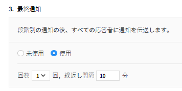 - [使用]ラジオボタンを選択すると、最終通知の繰返し間隔と回数を設定できます。