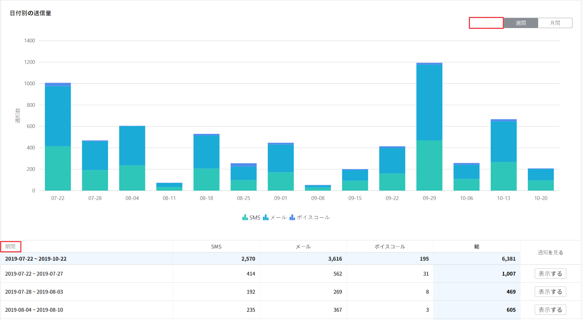 ③ 日付別の送信量:選択した期間内に送信した日付による通知送信量を表示する棒グラフであり、x軸は日付、y軸は通知個数を表します。また、異なるカラー設定で通知タイプ(SMS、ボイスコール、メール)を表します。表示オプションは日間、週間、月間が提供され、オプション選択によって下記のテーブルの期間表示が異なります。照会期間が35日以上の場合には、日間オプションが無効化されます。