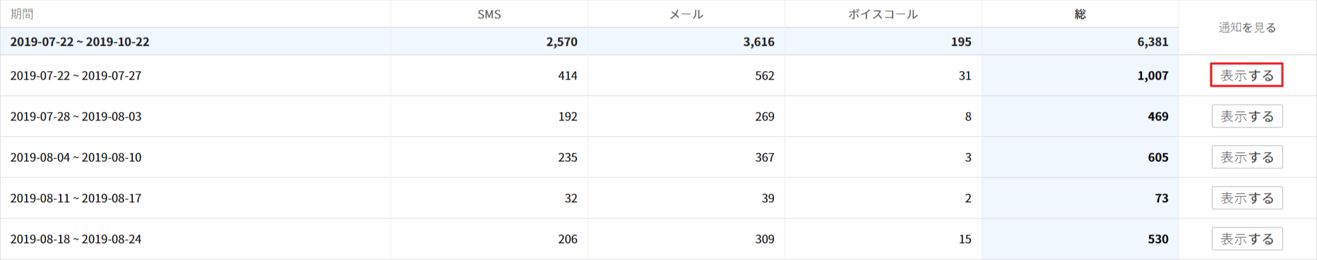 ③ 通知タイプ(SMS、ボイスコール、メール):選択した期間に送信したタイプ別の通知数を表示します。