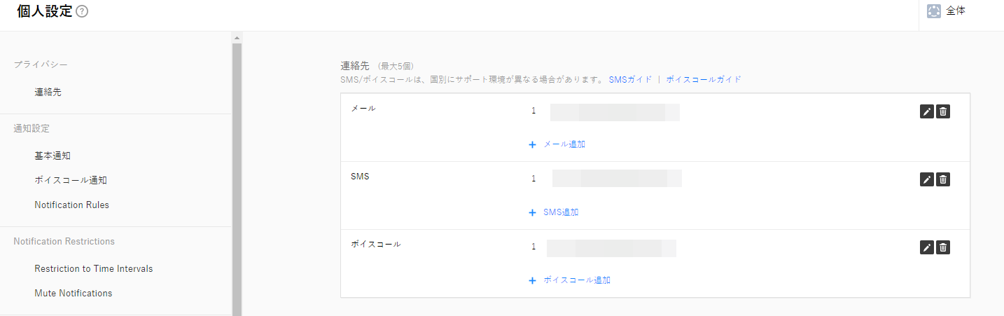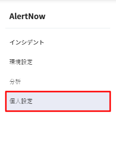 個人設定メニューに追加した連絡先(SMS、メール)のうち、インシデント通知を受信する連絡先を選択して通知を受信する状態を設定します。