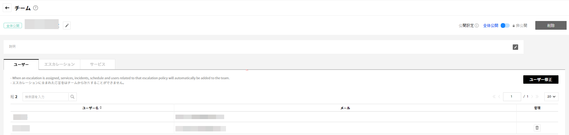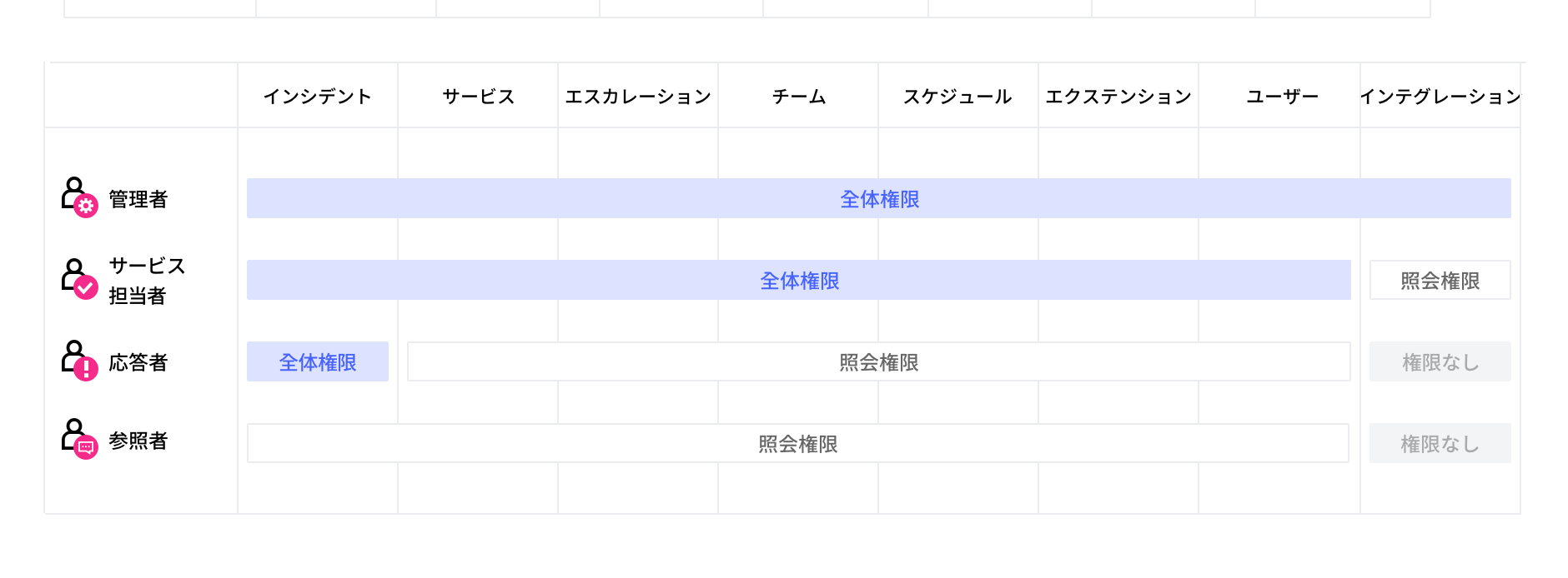 | ロール | 機能 | インテグレーション | スケジュール | エクステンション | チーム | インシデント | サービス | エスカレーション | ユーザー |