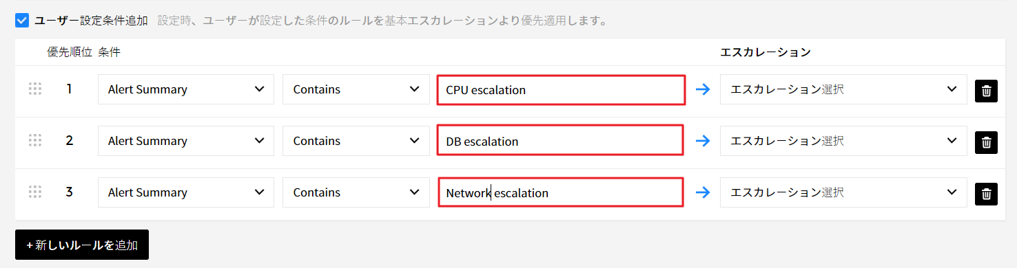 - エスカレーション:インシデントが発生した場合、段階別にそれを処理する担当者と、担当者が処理すべき作業と時間(タイムアウト)を設定して管理します。