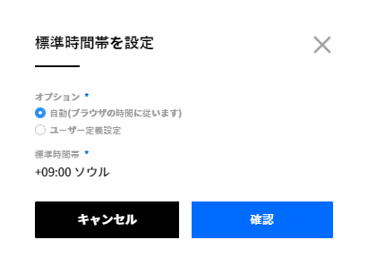 アイコンをクリックして標準時間帯を設定します。標準時間帯の設定ポップアップが次の通り表示されます。[ユーザー定義設定]ラジオボタンを選択すると、標準時間帯を変更できます。設定完了後、[確認]ボタンをクリックします。