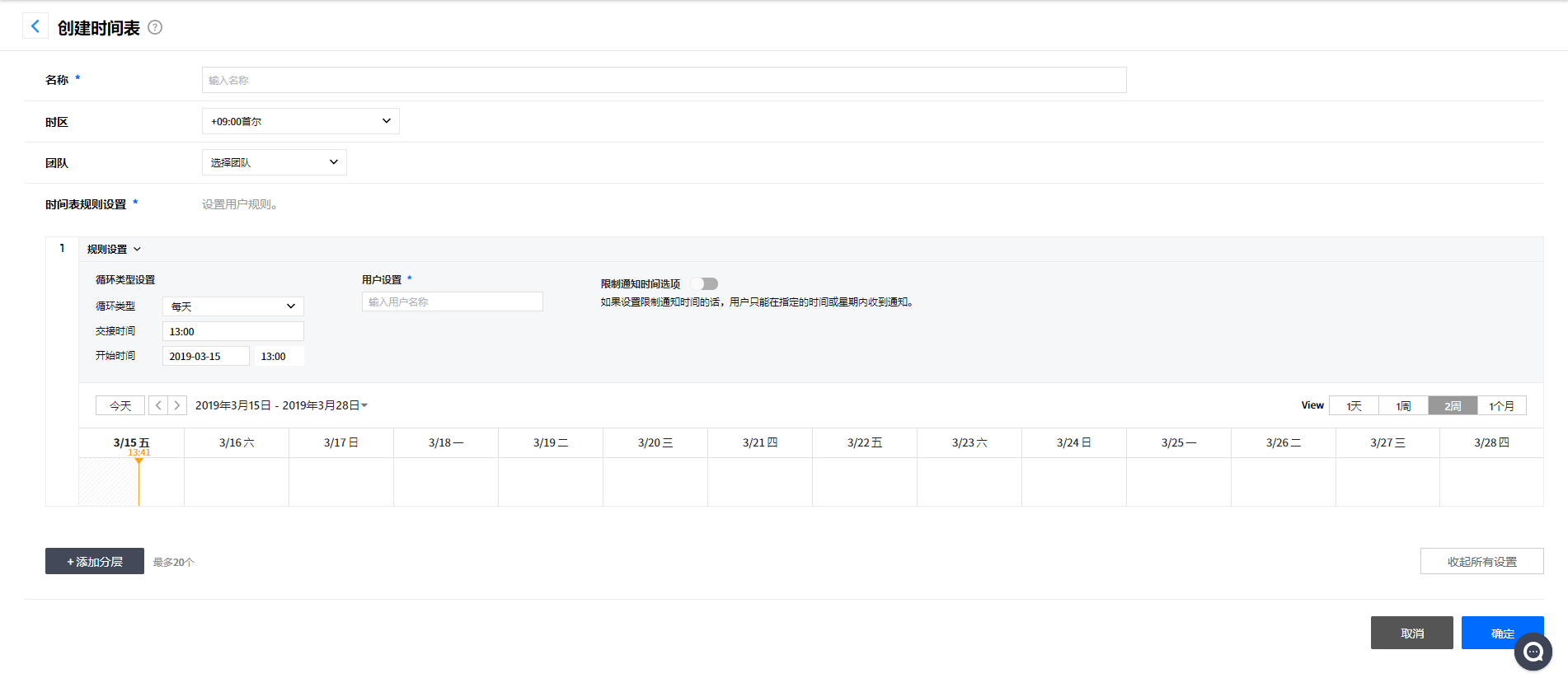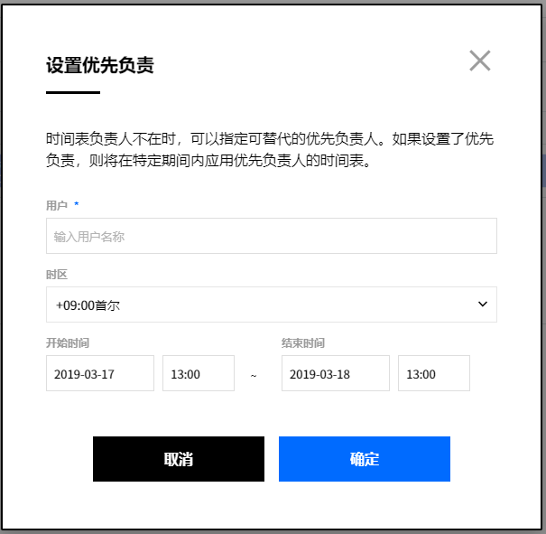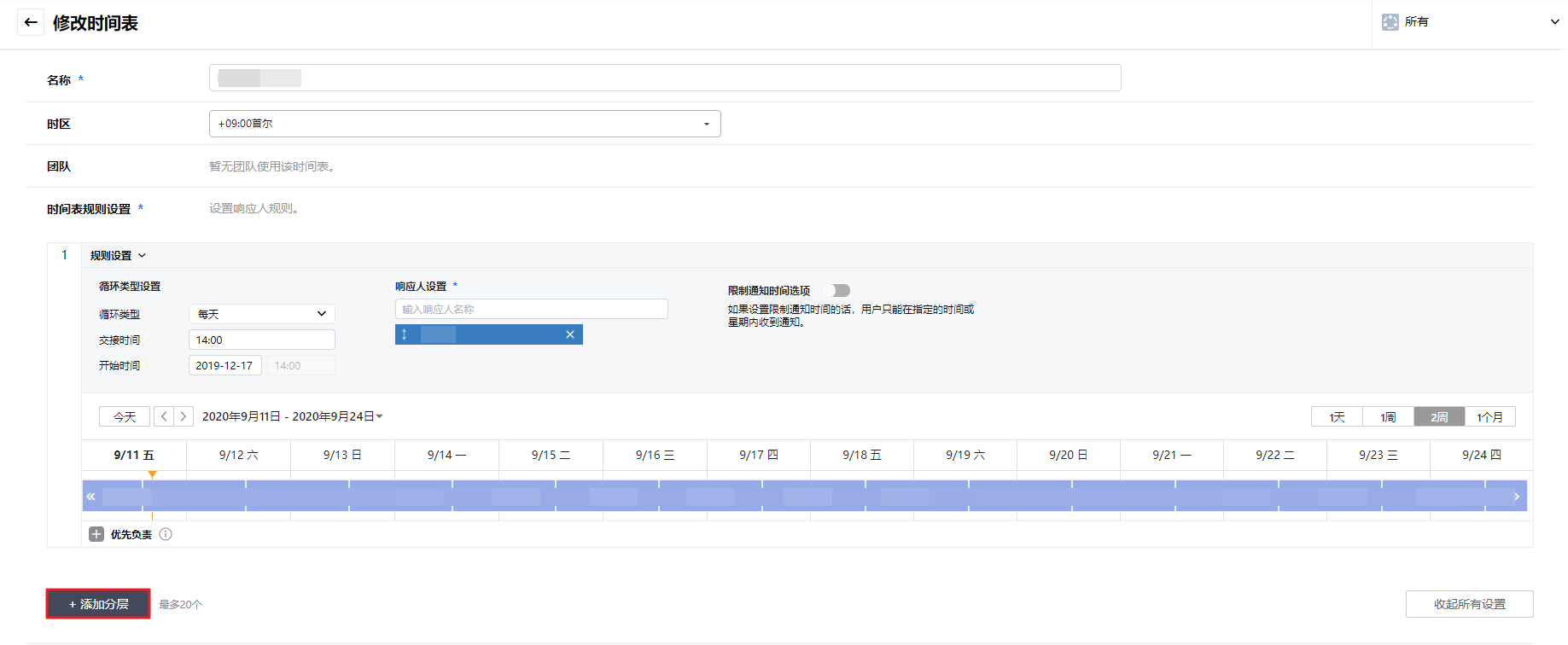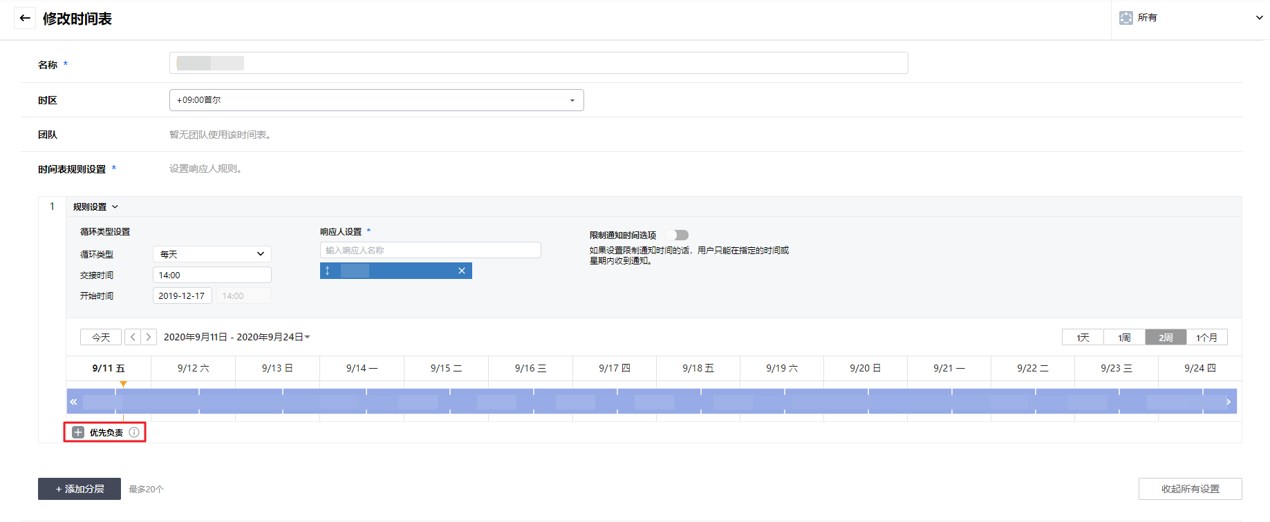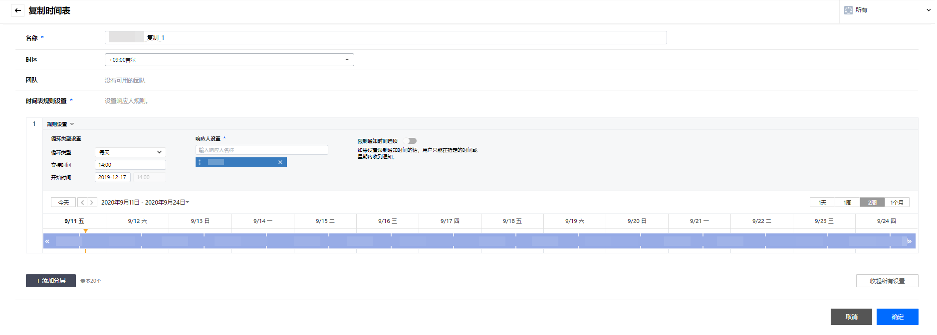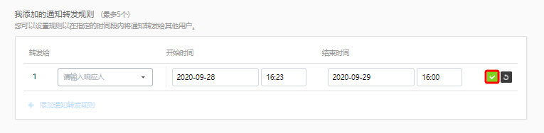 当用户无法接收通知时,可以设置在指定的时间内让其他用户接收通知。点击 通知转发规则设置响应者和开始/结束时间后,即可创建通知转发规则。