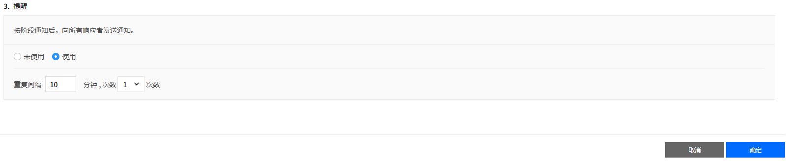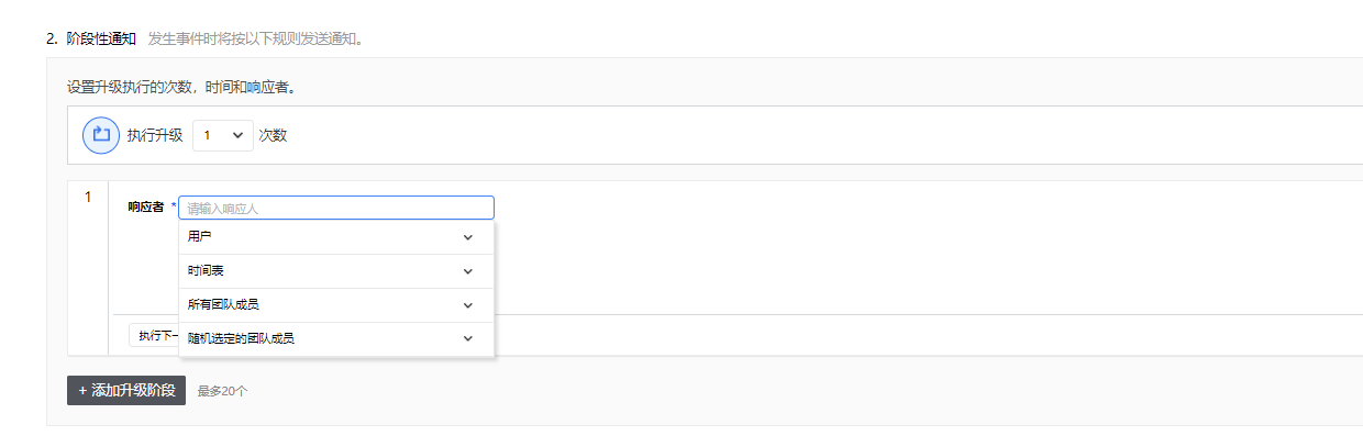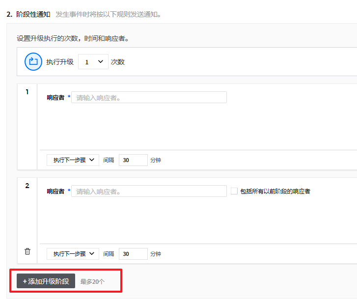 您可以点击[添加升级阶段]按钮来添加升级阶段,最多可添加20个升级阶段,可反复执行每个升级阶段。当您勾选[包含之前所有步骤的响应者]时,在发送通知时会包含之前所有步骤的响应者一起发送,被指定为各阶段响应者的用户都将收到通知。