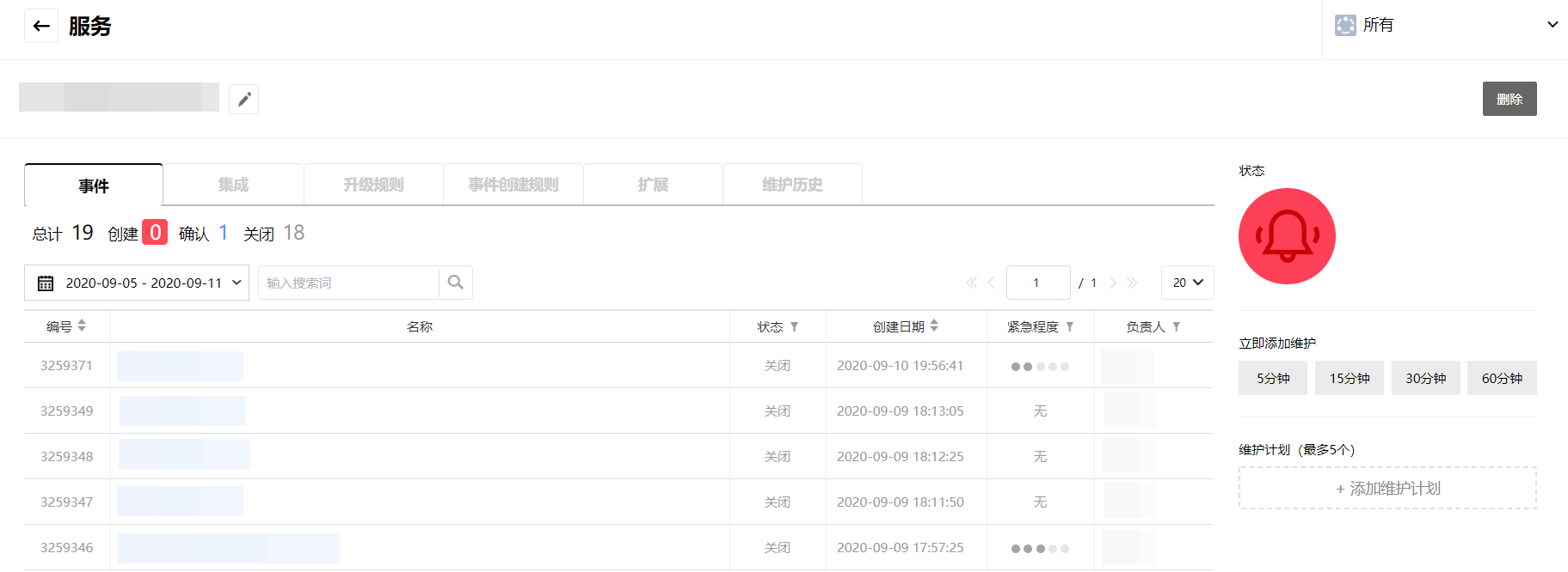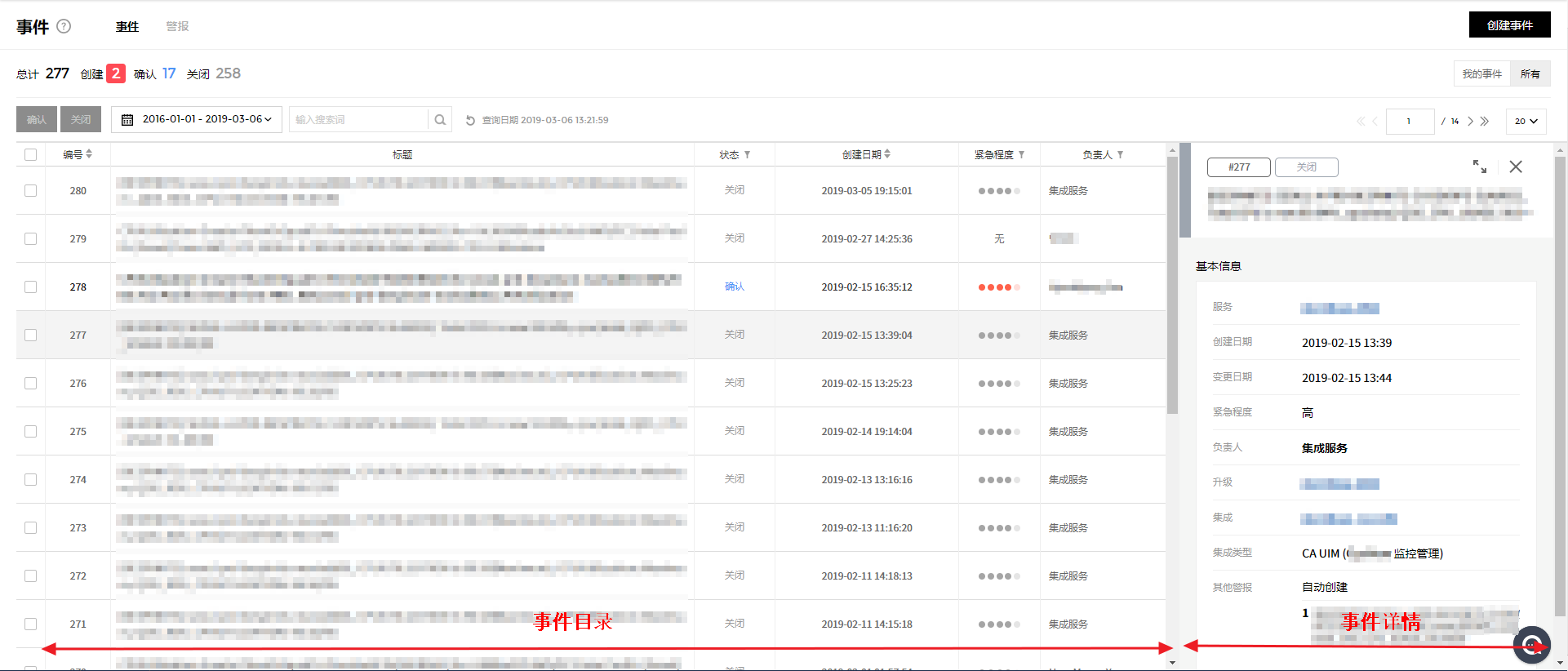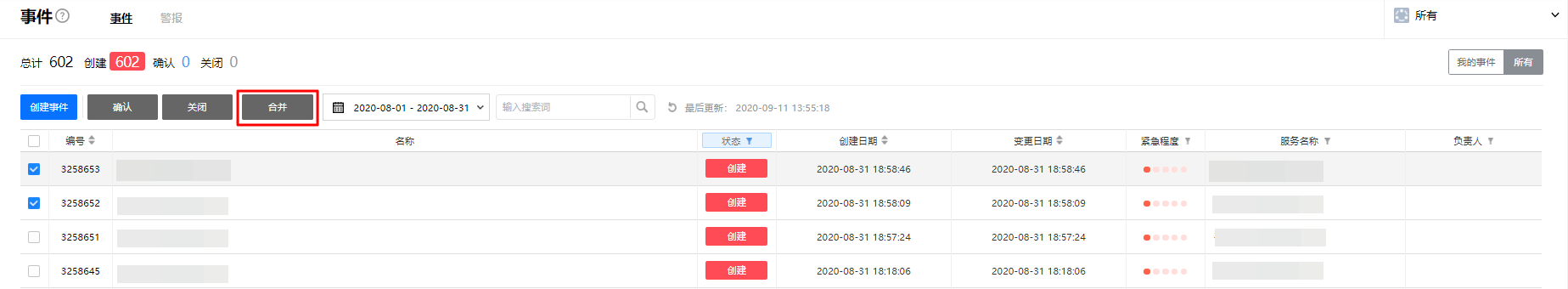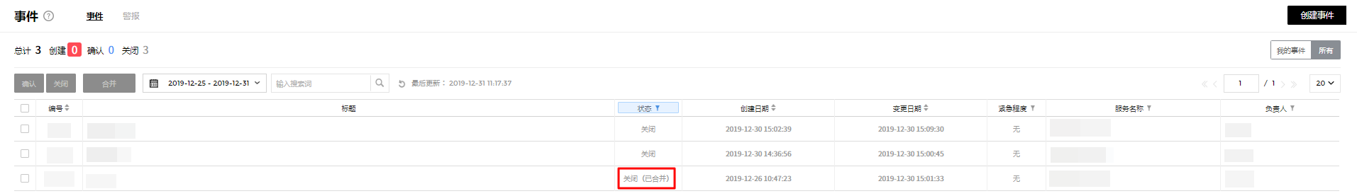 ⑤ 登录后用户可以查看事件。在所有选项卡中可以查看所有的事件,创建及确认选项卡中仅可查看相应状态的事件。您可将我的团队作为筛选条件查看事件,在我的团队页面中可以查看已将我的团队指定为负责人的事件。