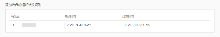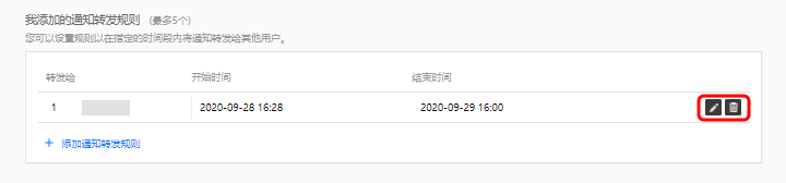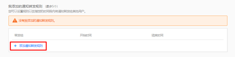 当用户无法收到通知时可以设置通知转发规则,使通知能够在指定的时间发送给其他用户。您最多可添加5个通知转发规则。