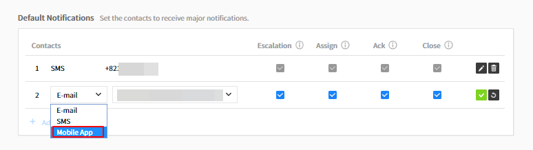 在个人设置的默认通知中添加联系方式并选择手机端APP后,即可通过手机端APP接收通知。