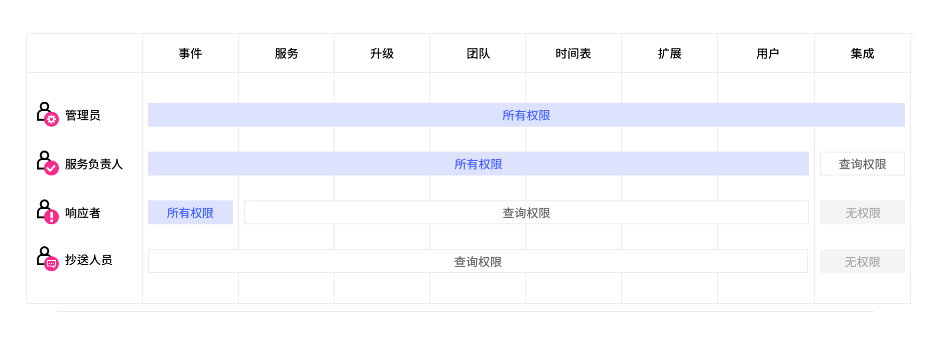 您可通过以下表格和图表查看管理员、服务负责人、响应者和抄送人员的角色权限。