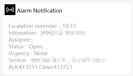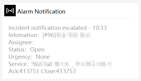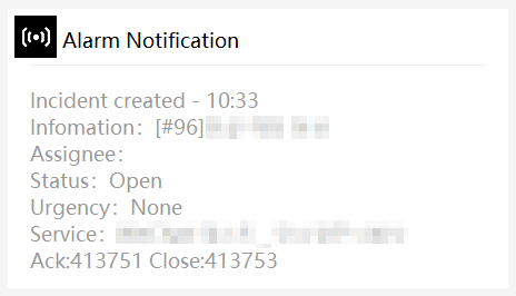| 事件发生时(单向) | 英文 | This is an AlertNow notification. You have an incident on {service name} service. The incident number is {incident number}. |
